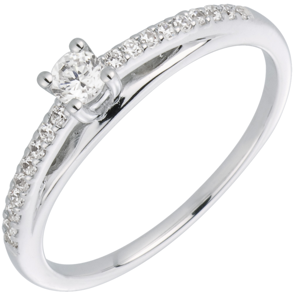 Un diamant solitaire est accompagné de diamants taille brillant pour un maximum d'éclat sur une monture en or blanc.