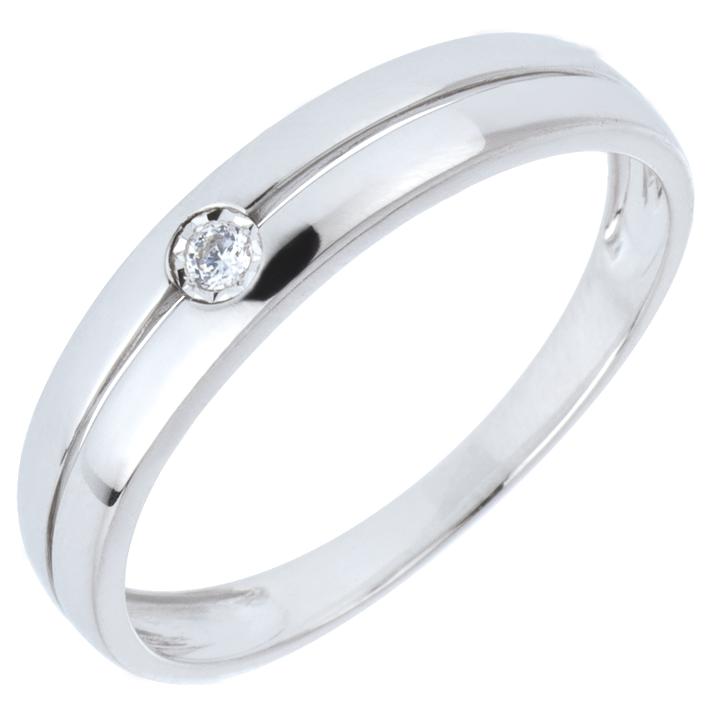 Un anneau en or blanc est traversé en son centre par une ligne d'horizon sur laquelle trône un diamant solitaire.