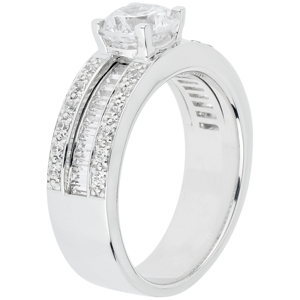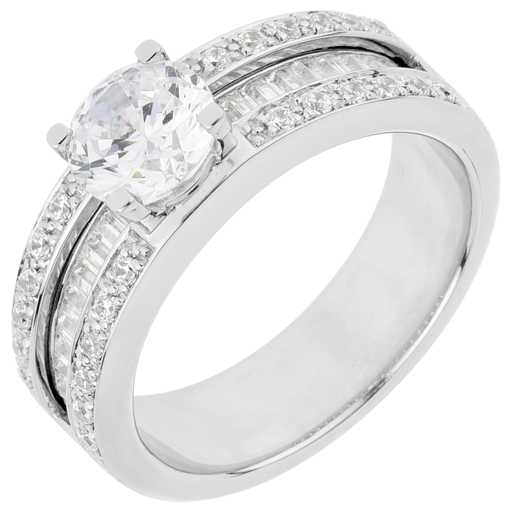 Un diamant solitaire pris entre 4 griffes est déposé sur une somptueuse monture pavée de diamants taille brillant et sertie de baguettes. Diamant central: 1 carat. 41 diamants : 1.6 carat - Or blanc (18 carats = 750/-): 9.4 g. Plus dimensions