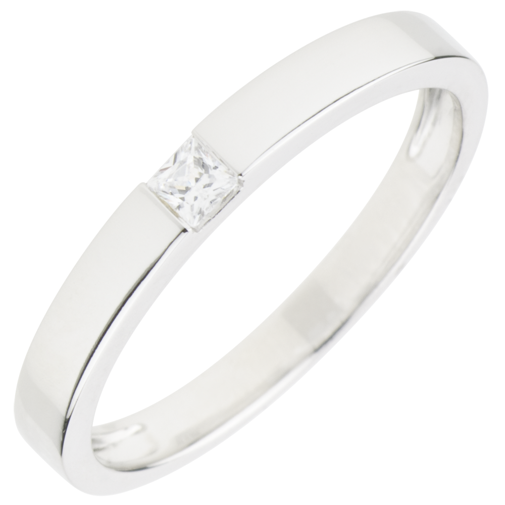 Un diamant carré taille princesse est pris dans une monture en or blanc, Un solitaire original et subtil offrant un confort de port optimal.