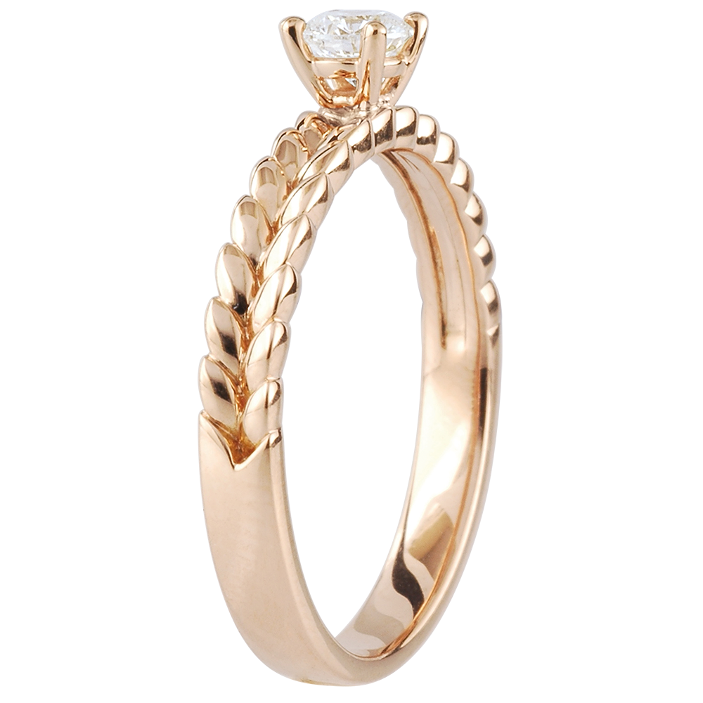 Un solitaire monté sur 4 griffes repose sur une monture de feuilles d'or tressées. Une bague de fiançailles originale et raffinée. 1 diamant : 0.2 carat - Or rose (9 carats = 375/1000): 2 g. Plus dimensions