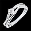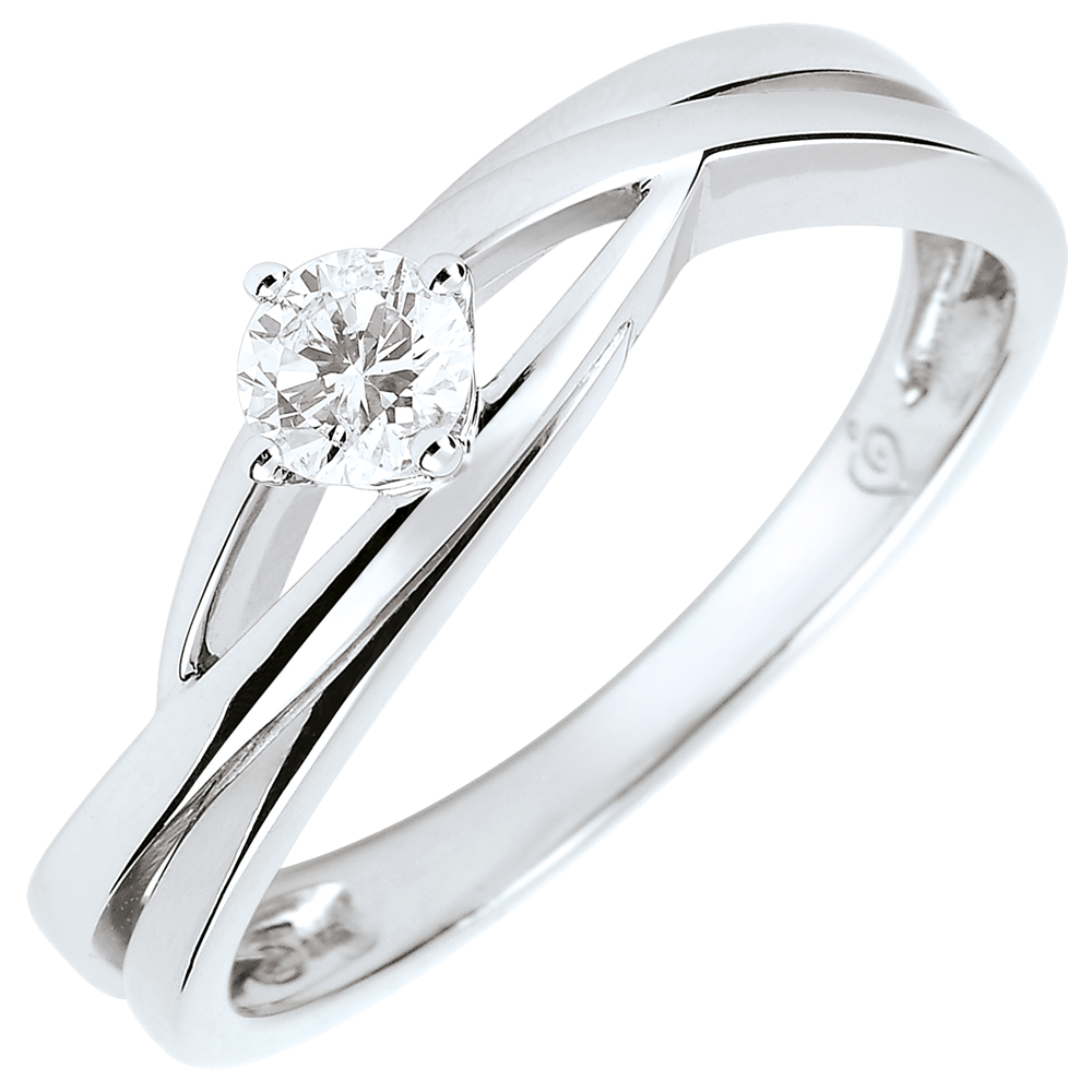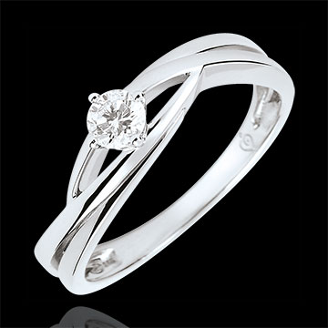 Un diamant solitaire est étreint en toute délicatesse et élégance. Une bague de fiançailles délicate et féminine. Pierre centrale 0.15 carat. 1 diamant : 0.15 carat - Or blanc (9 carats = 375/1000): 1.7 g. Plus dimensions