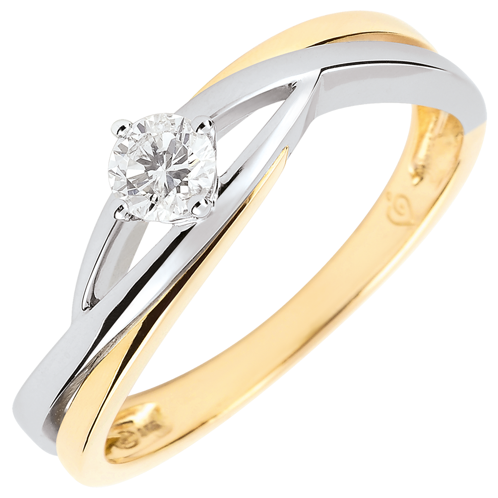 Un diamant solitaire est étreint en toute délicatesse et élégance. Une bague de fiançailles délicate et féminine. Pierre centrale 0.15 carat. 1 diamant : 0.15 carat - Or blanc et or jaune (18 carats = 750/-): 2 g. Plus dimensions
