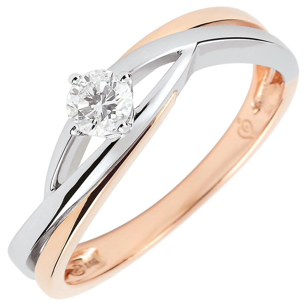 Un diamant solitaire est étreint en toute délicatesse et élégance. Une bague de fiançailles délicate et féminine. Pierre centrale 0.15 carat. 1 diamant : 0.15 carat - Or blanc et or rose (9 carats = 375/1000): 1.8 g. Plus dimensions