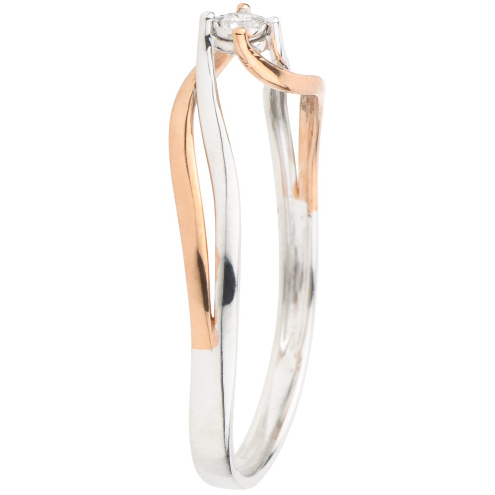 Un diamant culmine sur un double mouvement formé par l'union de l'or rose et de l'or blanc.
