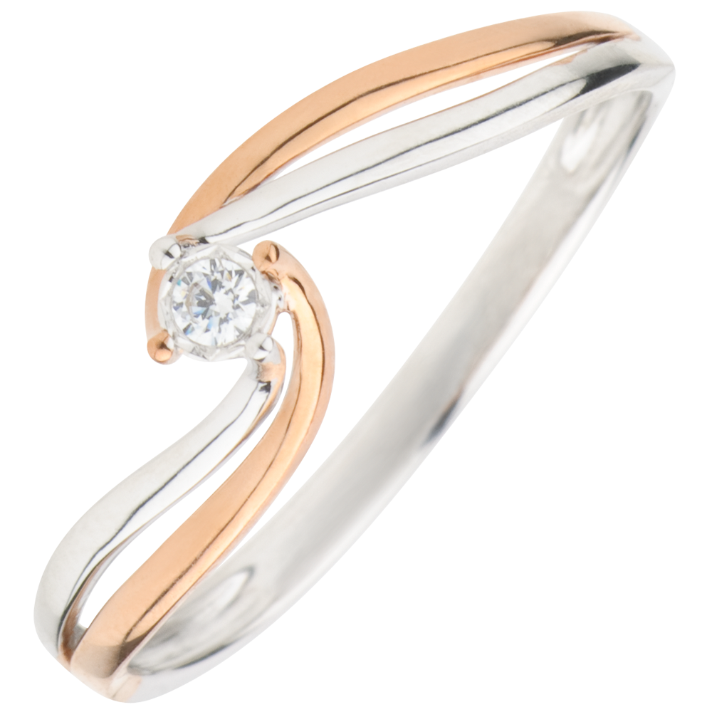 Un diamant culmine sur un double mouvement formé par l'union de l'or rose et de l'or blanc.