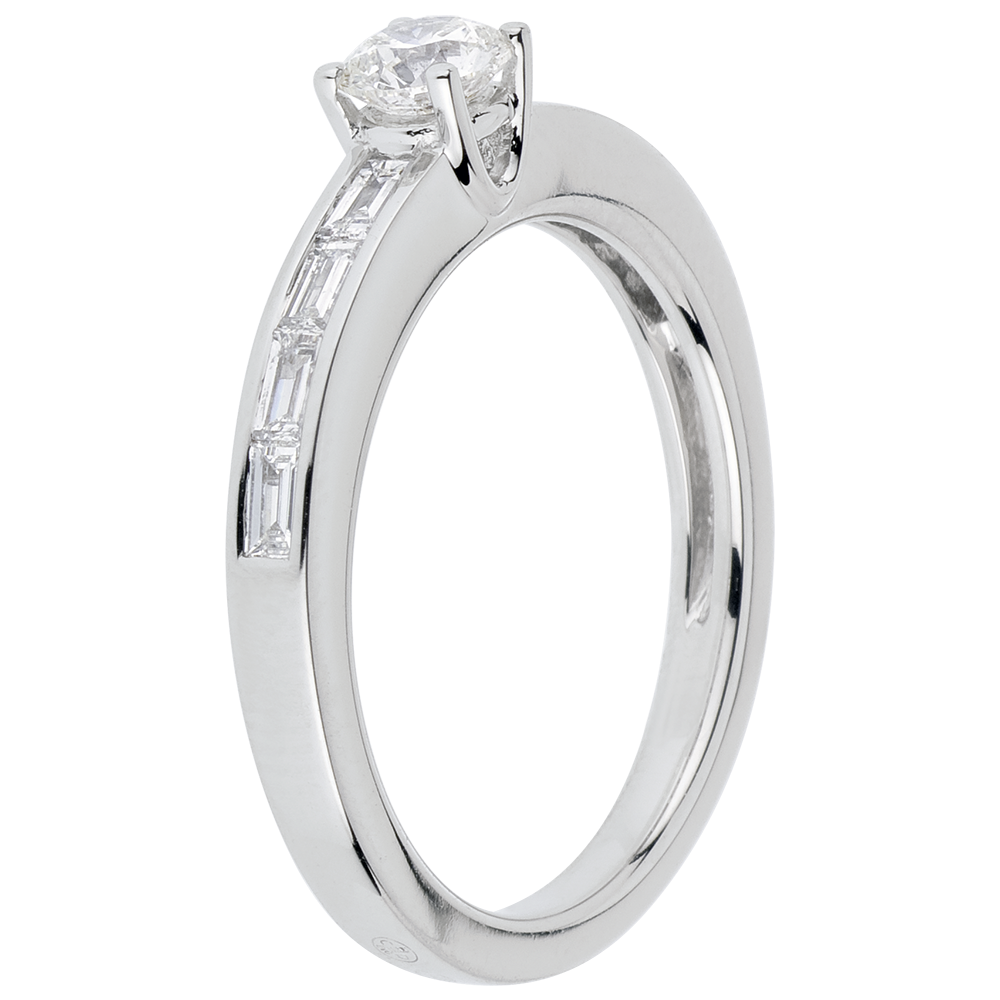 un diamant solitaire pris entre 4 griffes est déposé sur une luxueuse monture sertie de diamants baguette.