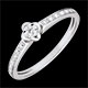 Une fleur délicate porte un diamant solitaire sur un anneau de diamants. Diamant de centre: 0.03 carat. 15 diamants : 0.09 carat - Or blanc (18 carats = 750/-): 1.7 g. Plus dimensions