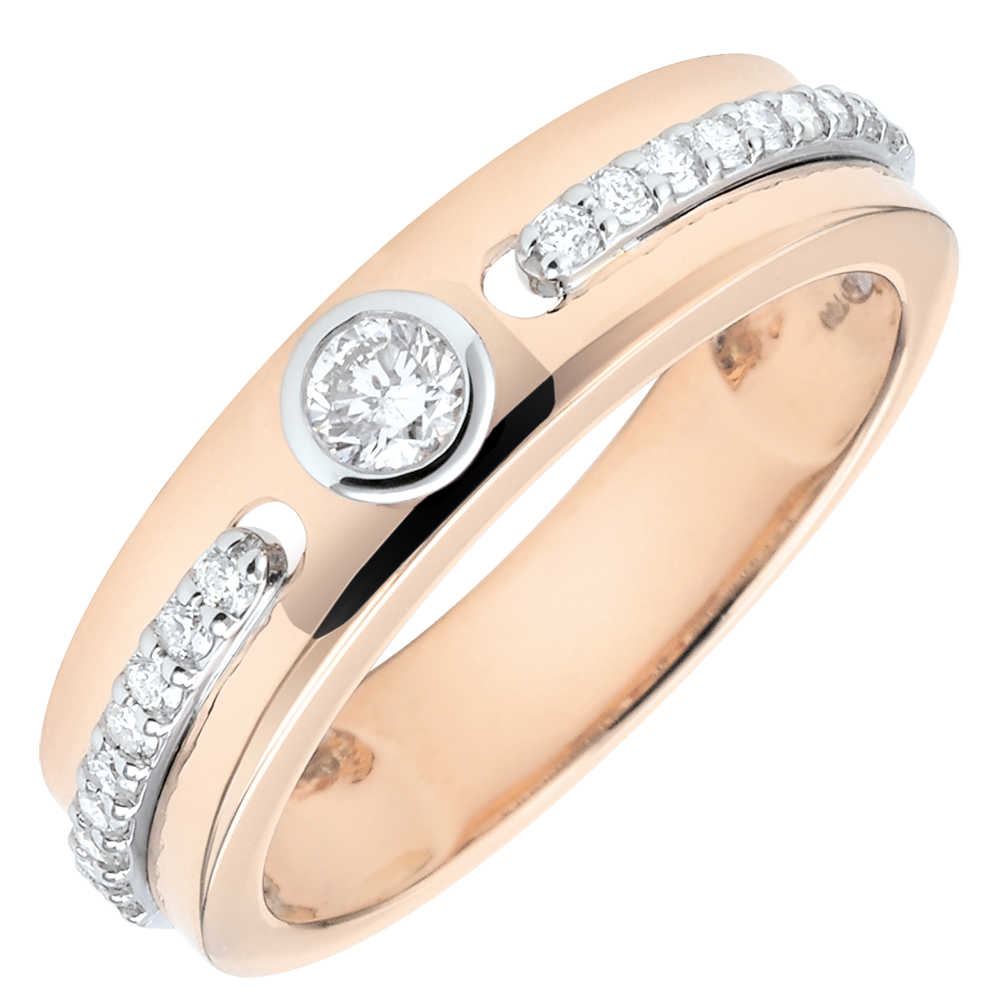 Deux lignes de diamants sur un anneau d'or rose sont unies autour d'un solitaire comme une promesse d'éternité.