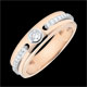 Deux lignes de diamants sur un anneau d'or rose sont unies autour d'un solitaire comme une promesse d'éternité.