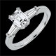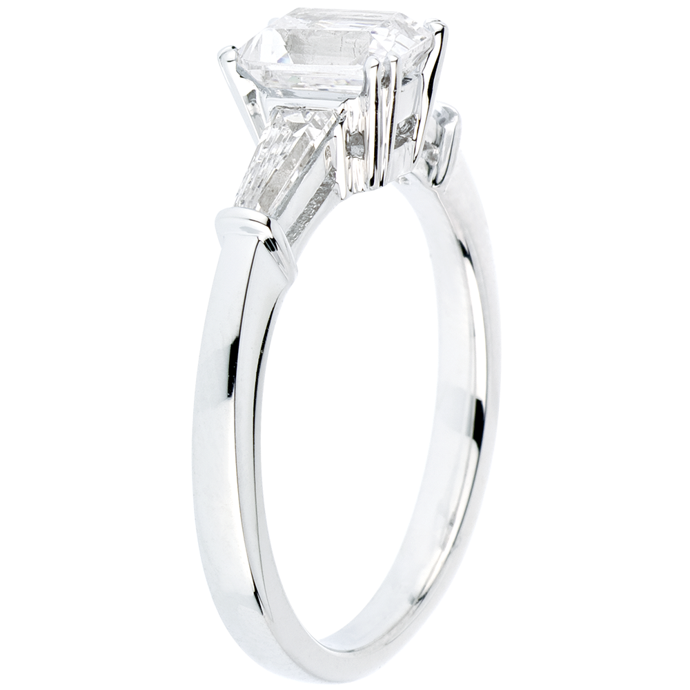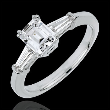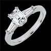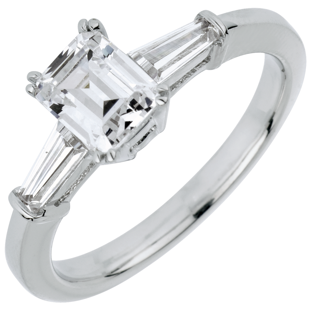 Un diamant solitaire taille émeraude est élégamment épaulé par deux diamants baguette.