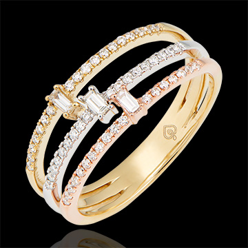 Une bague qui allie avec délicatesse les 3 couleurs d'or sous 3 anneaux pavés rehaussés chacun d'un diamant baguette.