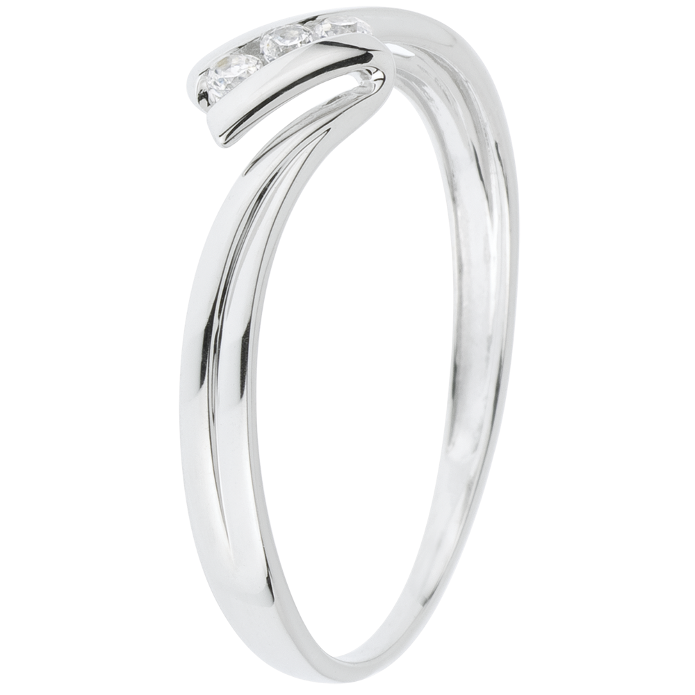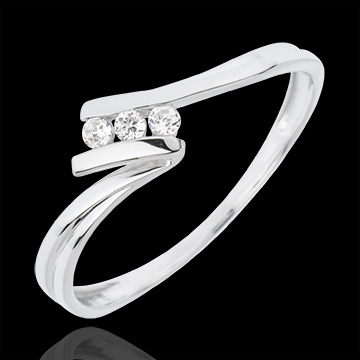 Trois diamants étreints avec énergie dans un mouvement d'or blanc.