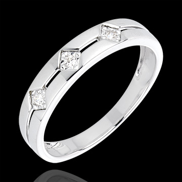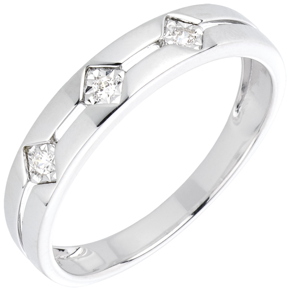 trois losanges incrustés de diamants composent la trilogie de cette bague en or blanc.