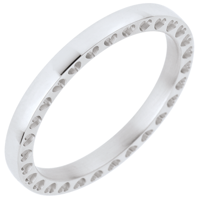 une alliance en or blanc avec un motif de coeur découpé à l'infini dans sa tranche.