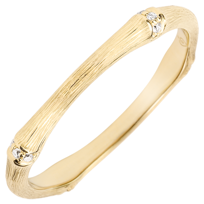 Une branche de bambou souple et solide se métamorphose en un anneau d'or jaune brossé éternel, serti de diamants. Le travail à la main de la finition matte lui confère un aspect naturel au réalisme saisissant. 12 diamants : 0.04 carat - Or jaune (18 carats = 750/-): 1.9 g.Plus dimensions