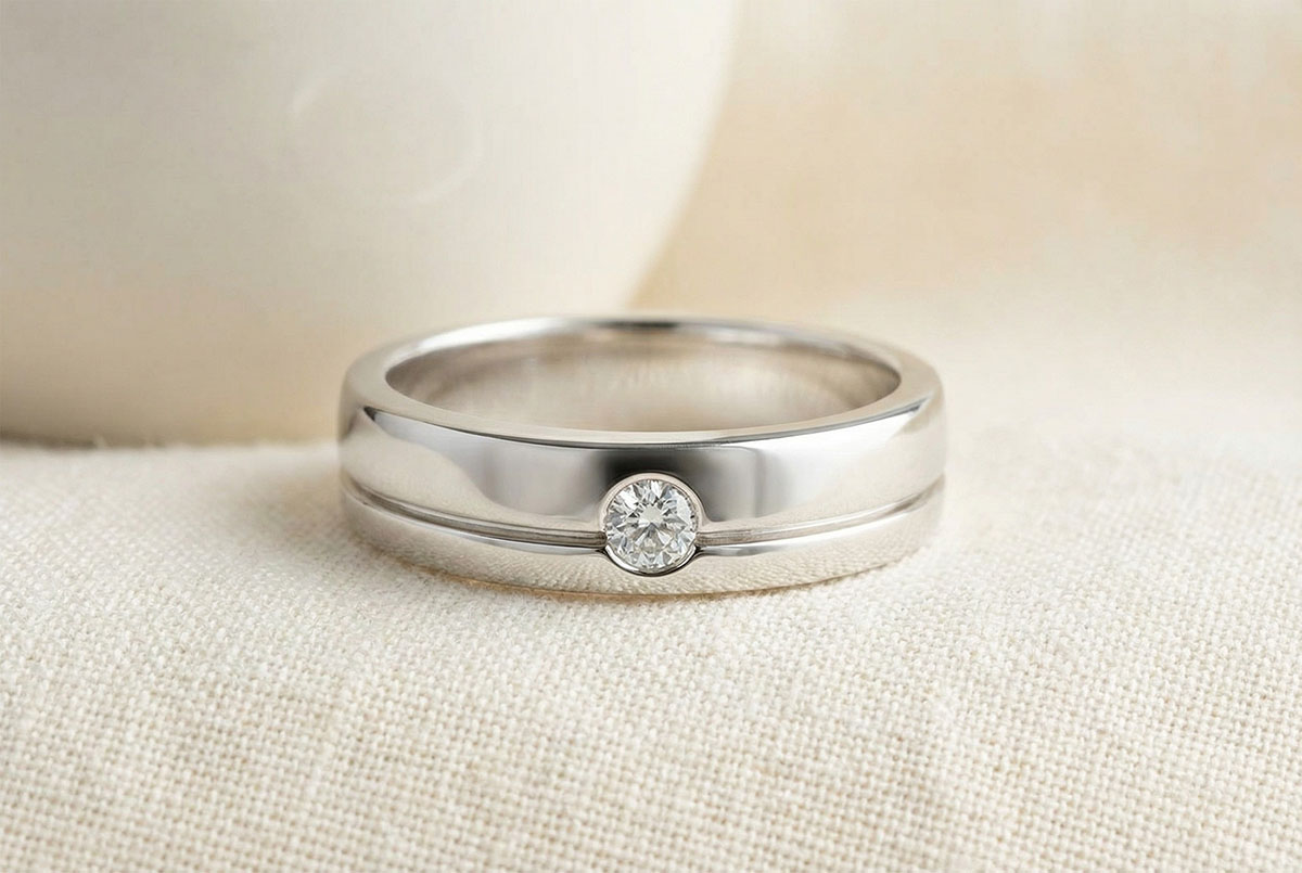Cette alliance au design aéré par une ligne horizontale porte en son centre un diamant.