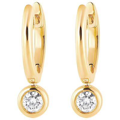 Une paire de créoles tout or jaune dont la pampille sertie diamant scintille délicatement à chaque mouvement.