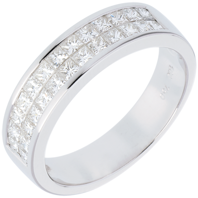 Un anneau de section carrée, au pavage semi circulaire. Diamants taille princesse sertis rail deux rangs.