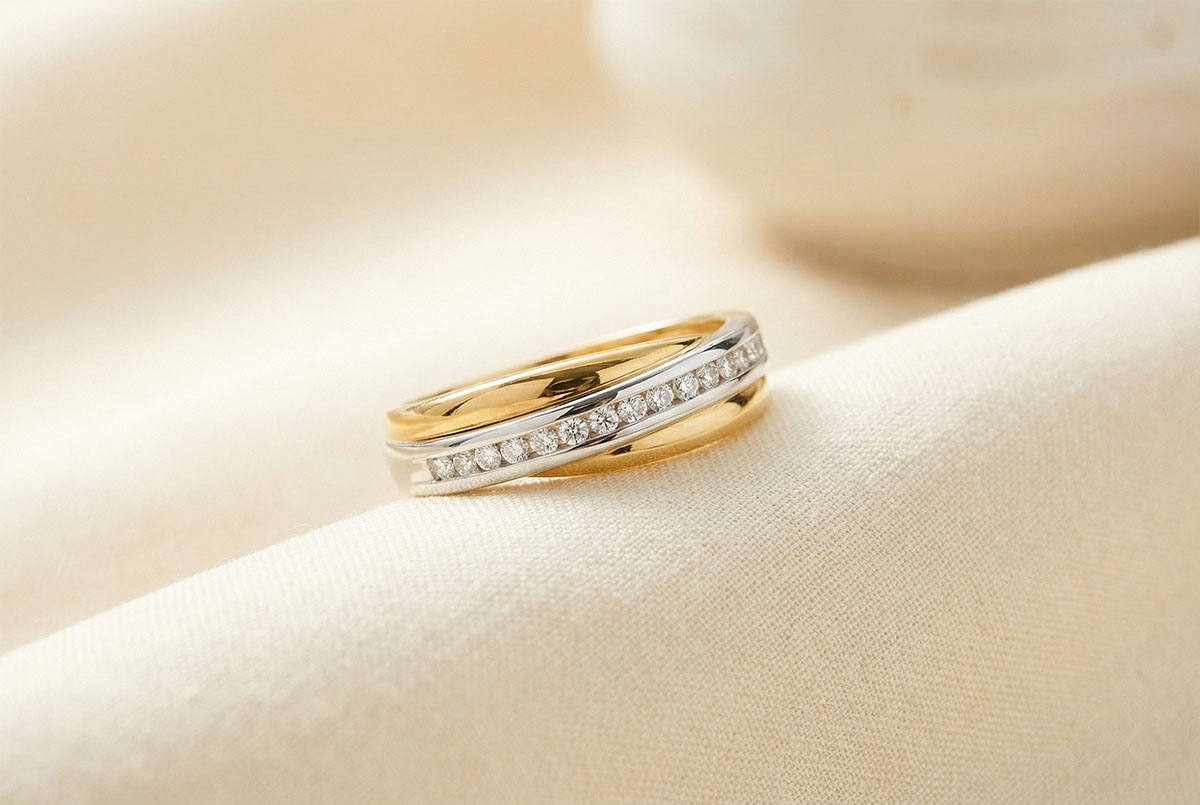Une alliance or jaune enlacée d'un arceau or blanc pavé diamants - serti rail.