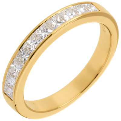Un anneau de section carrée, au pavage semi circulaire. Diamants taille princesse sertis rail.