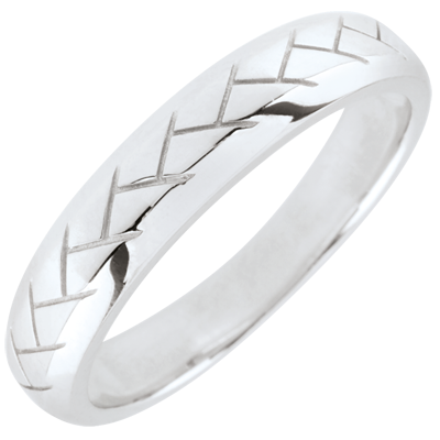 Un anneau aux bords biseautés est tissé en or blanc en son centre.