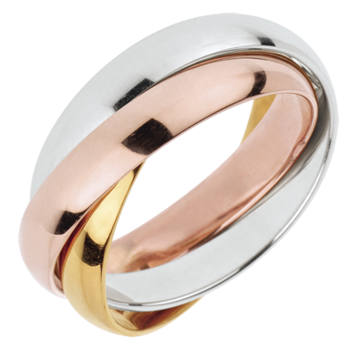 Un anneau en or jaune, un anneau en or blanc et un anneau en or rose sont unis.