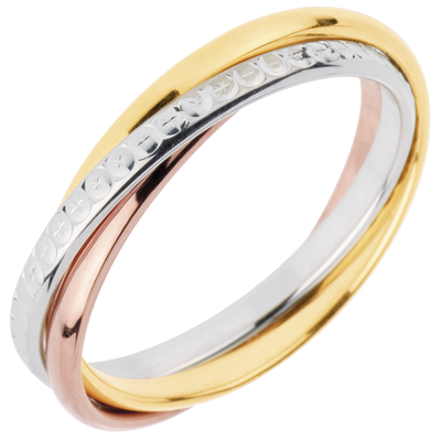 Un anneau en or jaune, un anneau en or blanc travaillé façon diamant et un anneau en or rose sont unis pour l'éternité.