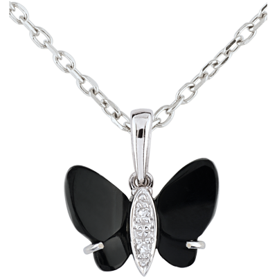 Des ailes d'onyx, un corps d'or et diamants pour ce papillon unique et envoûtant. Livré sans chaîne. 2 diamants : 0.01 carat - Or blanc (9 carats = 375/1000): 0.4 g. Onyx noir : 2 - Total: 0.96 carat Plus dimensions
