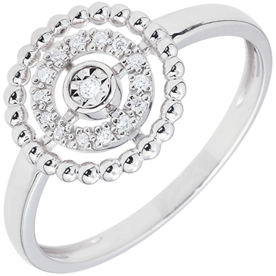 Un cercle de perles d'or entoure un cercle de diamants et un solitaire en son centre. 15 diamants : 0.05 carat - Or blanc (9 carats = 375/1000): 1.6 g. Plus dimensions