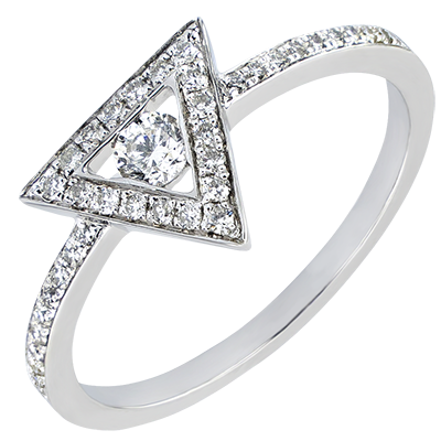Un diamant lové dans un triangle serti diamants, pour une bague graphique et moderne, symbole d'équilibre et fort de personnalité. Anneau demi-serti diamants.