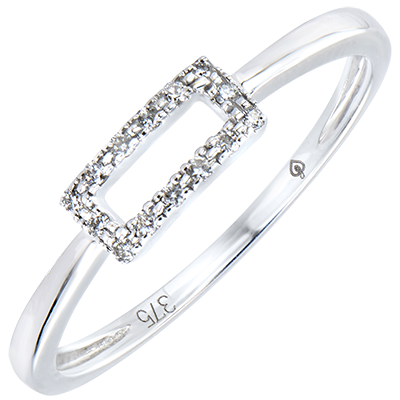 Une monture minimaliste et graphique, composée d'un rectangle pavé ajouré. Une bague contemporaine, un bijou du quotidien.