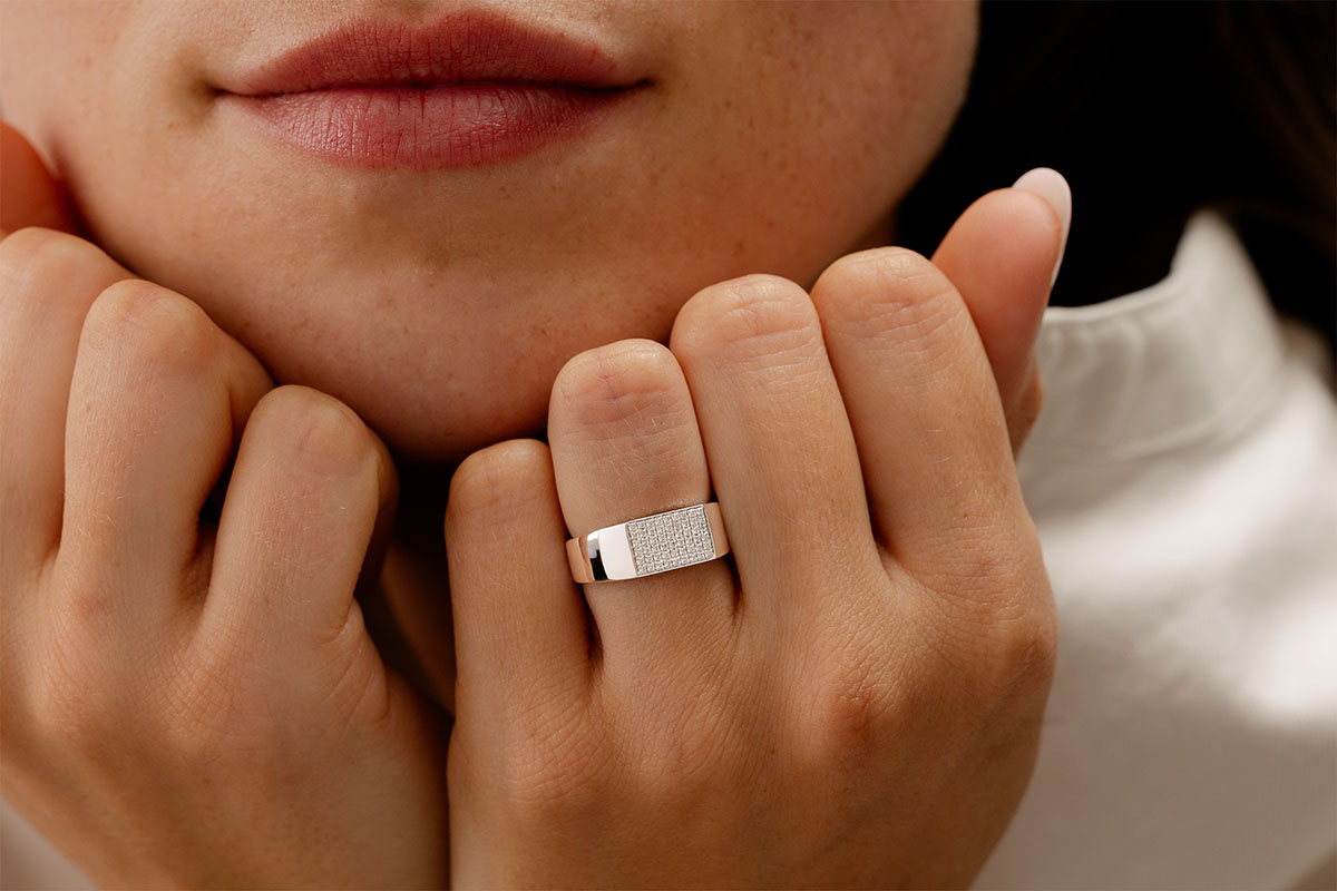 Une chevalière en or blanc, dont le plateau rectangulaire est généreusement pavé de 54 diamants. Un bijou délicat et généreux à la fois. 54 diamants : 0.2 carat - Or blanc (9 carats = 375/1000): 3.1 g.Plus dimensions