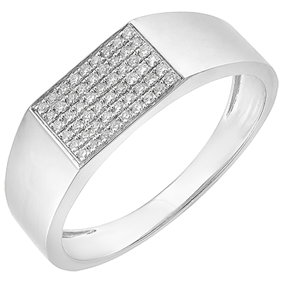 Une chevalière en or blanc, dont le plateau rectangulaire est généreusement pavé de 54 diamants. Un bijou délicat et généreux à la fois. 54 diamants : 0.2 carat - Or blanc (9 carats = 375/1000): 3.1 g. Plus dimensions