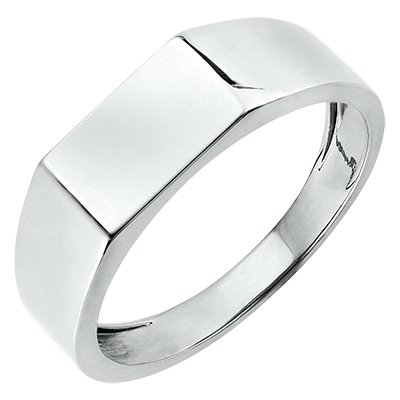 Une chevalière tout or blanc au plateau rectangulaire. Un bijou simple et élégant à la fois.
