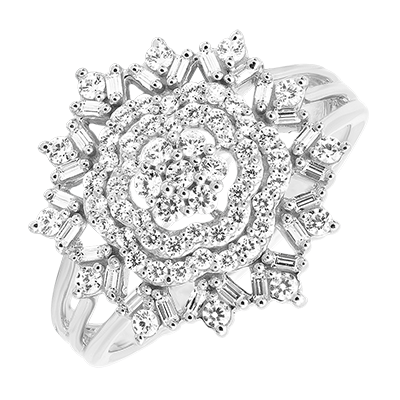 La bague Eden est un chef-d'œuvre de raffinement floral, magnifiquement sertie de diamants. Son design évoque un jardin d'éclat éternel, rayonnant de lumière et de grâce 85 diamants : 0.82 carat - Or blanc (9 carats = 375/1000): 3.4 g. Plus dimensions
