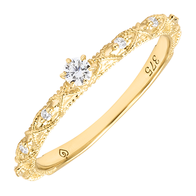 Un diamant central éclatant de 0.06 carat, accompagné de six pierres serties dans un motif sculpté tout en finesse.Une bague précieuse aux reflets solaires, où chaque détail évoque la grâce et la lumière. Or jaune (9 carats = 375/1000): 1.4 g. Diamant synthétique : 7 - Total: 0.12 caratPlus dimensions