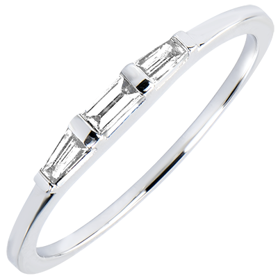 Une trilogie de diamants taille baguette aux lignes pures pour un grand classique du solitaire accompagné.