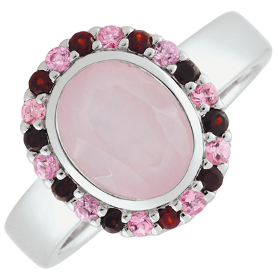 Une marguerite de pierres fines à la disposition audacieuse: quartz rose au centre est entouré de topazes et grenats. Un ravissement de fraicheur et de féminité. Argent massif 925/-: 4 g. Quartz rose : 1 - Grenat : 10 - Tourmaline rose : 10 - Total: 2.29 carat Plus dimensions