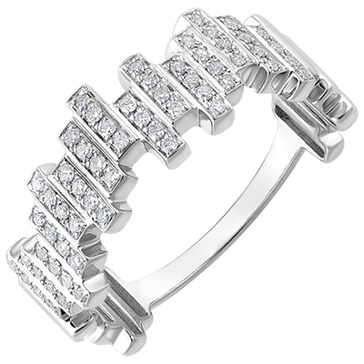 Une partition de baguettes d'or blanc et de diamants sertis pour une bague délicieusement harmonieuse.