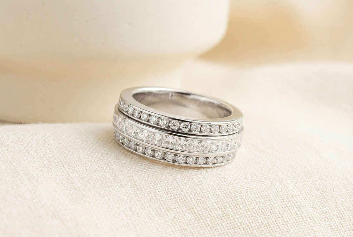 Un anneau large composé d'un rail de 13 diamants princesse entouré par deux rails de diamants brillants, crée une géométrie et un éclat parfait. 43 diamants : 1.46 carat - Or blanc (18 carats = 750/-): 12 g.Plus dimensions
