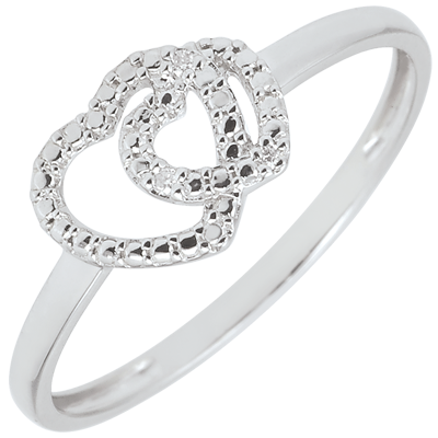 Cette bague en duo de coeurs en or blanc travaillé façon diamant et incrustée de diamants inspire tendresse et complicité.