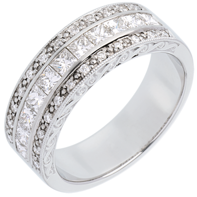 Un sublime anneau au pavage 3 rangs alterne serti rail de diamants taille princesse et serti grain de brillants pour optimiser l'éclat et le scintillement. Une bague à la fois sobre et somptueuse. 35 diamants : 0.87 carat - Or blanc (18 carats = 750/-): 7.5 g. Plus dimensions
