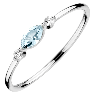La précieuse pupille symbolisée par une navette de topaze bleue trone au centre de cette fine monture en fil d'or blanc. Elle est entourée par deux sublimes diamants telles deux larmes figées à jamais. Une bague pétillante et précieuse à porter seule ou à empiler selon vos envies. Dimensions pierre centrale : longueur: 5mm - largeur: 2.5mm. 2 diamants : 0.03 carat - Or blanc (9 carats = 375/1000): 0.7 g. Topaze bleue : 1 - Diamant : 2 - Total: 0.16 carat Plus dimensions