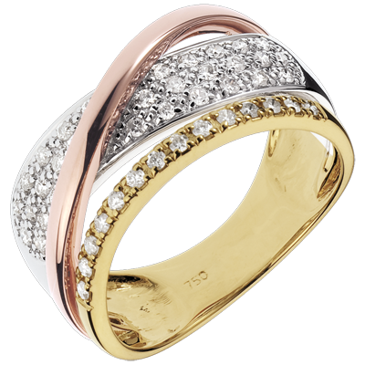 Deux anneaux or jaune et or blanc pavés de diamants épousés par un anneau d'or rose pour un luxueux voyage sur Saturne. Une bague trois ors intemporelle et exceptionnelle. 45 diamants : 0.41 carat - Trois ors (18 carats = 750/-): 5.7 g. Plus dimensions