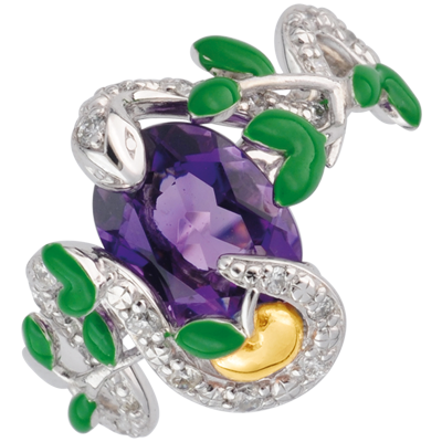 Un serpent en argent et diamants se camouffle parmi les feuillages pour protéger la pomme, fruit de la tentation. Améthyste violette, pomme en argent recouverte d'or jaune et feuilles recouvertes de laque verte. 20 diamants : 0.2 carat - Argent massif 925/-: 3.9 g. Améthyste : 1 - Diamant : 20 - Total: 1.917 carat Plus dimensions