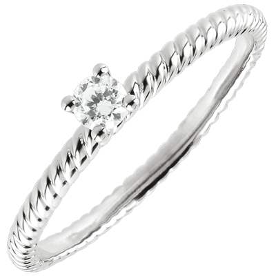 Un diamant solitaire maintenu par 4 griffes et posé sur un précieux cordage d'or. Une bague de fiançailles originale et intemporelle. 1 diamant : 0.1 carat - Or blanc (9 carats = 375/1000): 1.1 g. Plus dimensions