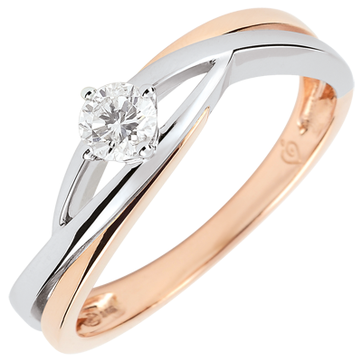 Un diamant solitaire est étreint en toute délicatesse et élégance. Une bague de fiançailles délicate et féminine. Pierre centrale 0.15 carat. 1 diamant : 0.15 carat - Or blanc et or rose (9 carats = 375/1000): 1.8 g. Plus dimensions