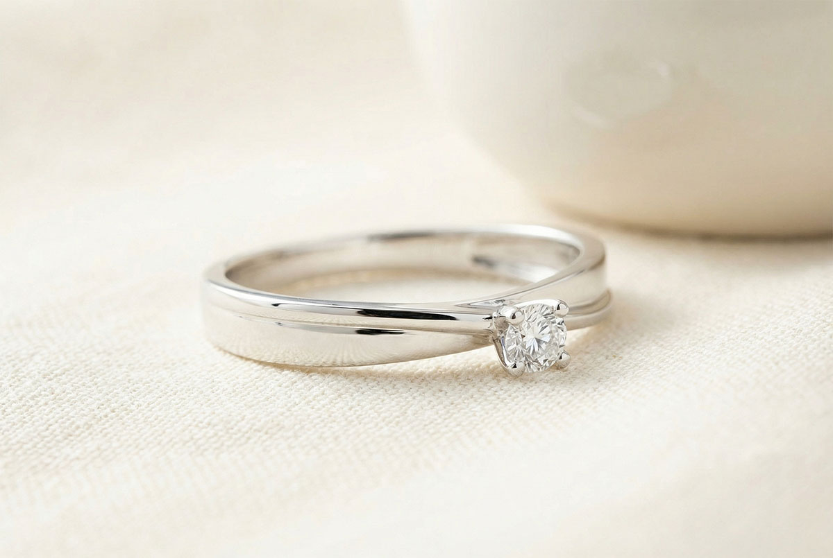 un bandeau d'or blanc élégant est traversé par une ligne moderne portant un diamant entre 4 griffes.