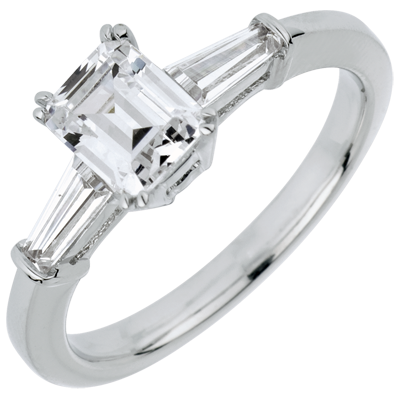 Un diamant solitaire taille émeraude est élégamment épaulé par deux diamants baguette.